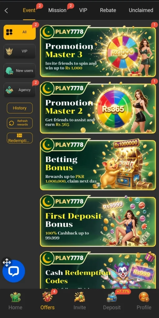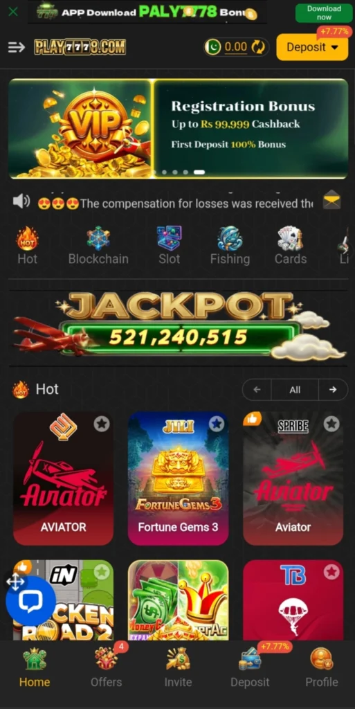 Play7778 Game offers a simple and fast-paced gaming experience for users who enjoy mobile casino-style platforms. The application focuses on easy navigation, quick deposits, and accessible gameplay, which makes it appealing to many players in Pakistan.